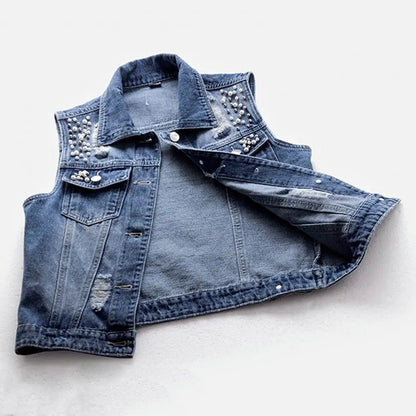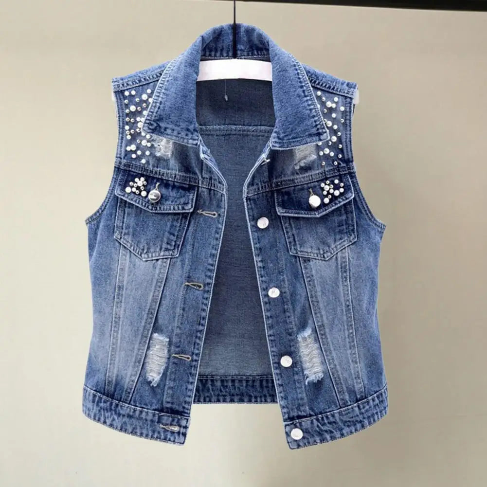 Women Coat Ladies Vest Vintage Denim Vest Bead Decor Single-breasted Hop Streetwear for Ladies Fall/spring Waistcoat with Solid
