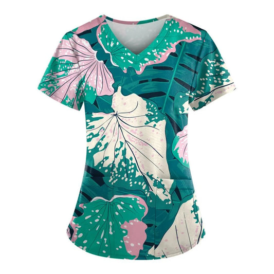 Scrub Medical Woman Floral Print Vet Nursing Tops Fashion V-Neck Short Sleeve Patch Pocket Health Care Clinical Uniform Woman