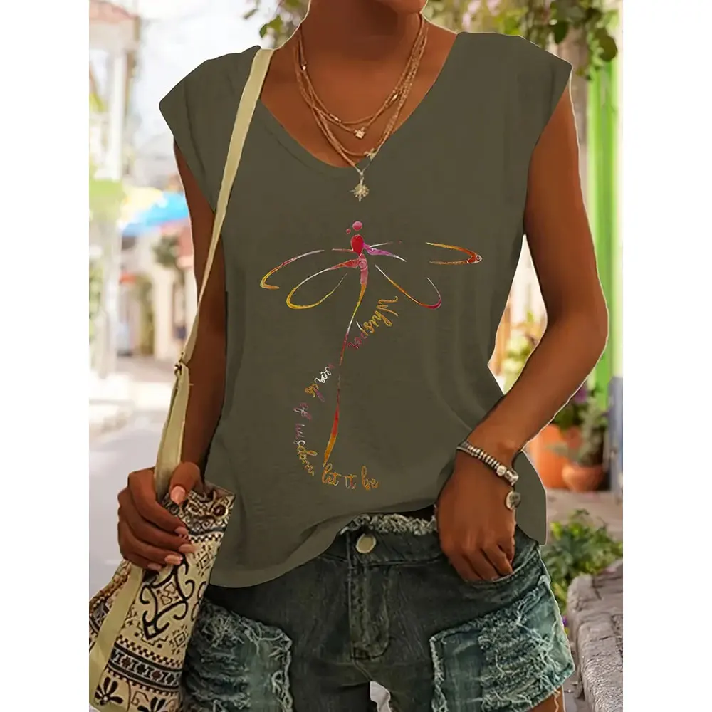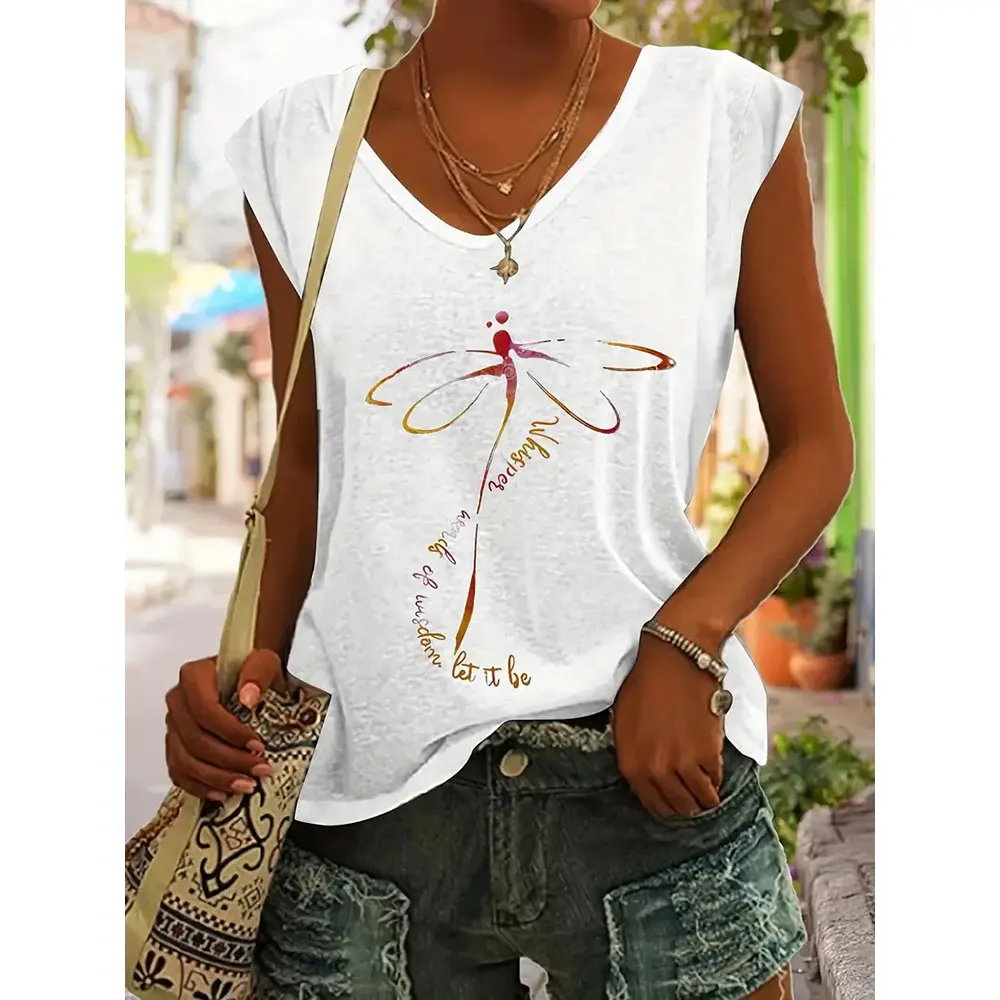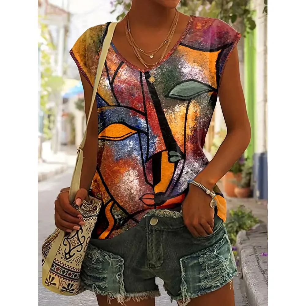 V-Neck T-shirts Women's Vest Summer Casual Abstract Face Printed Sleeveless Loose Basic Tops Tees Streetwear Female Clothing
