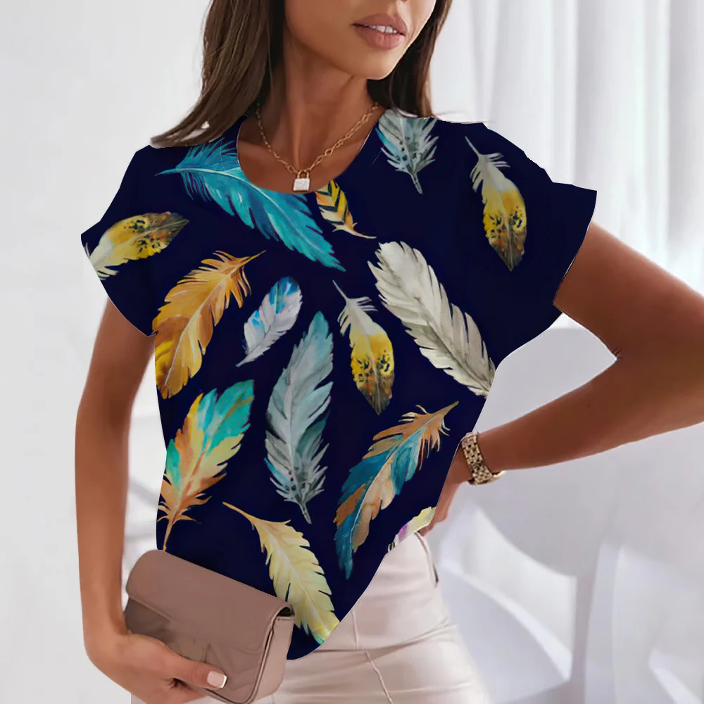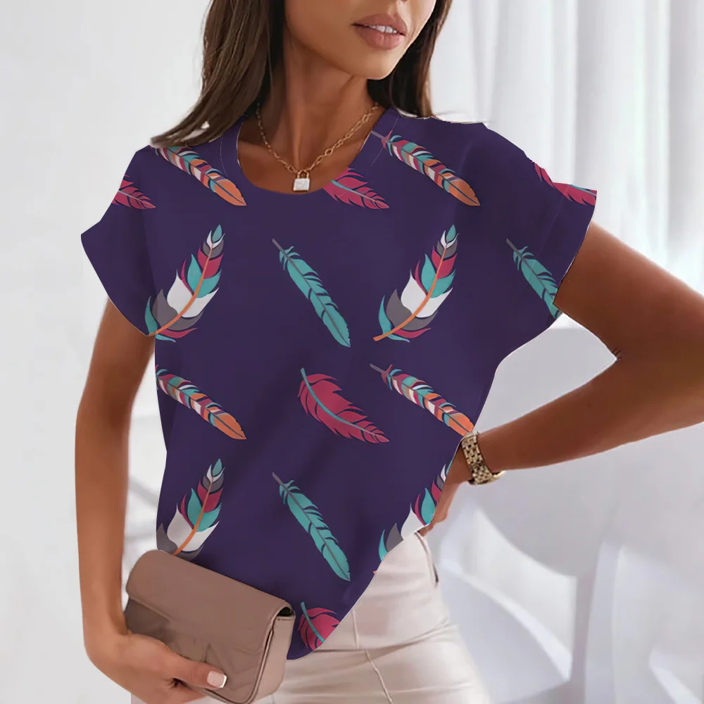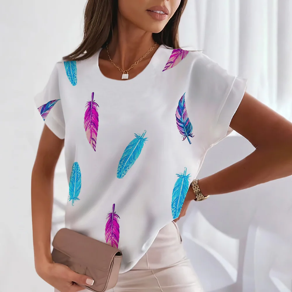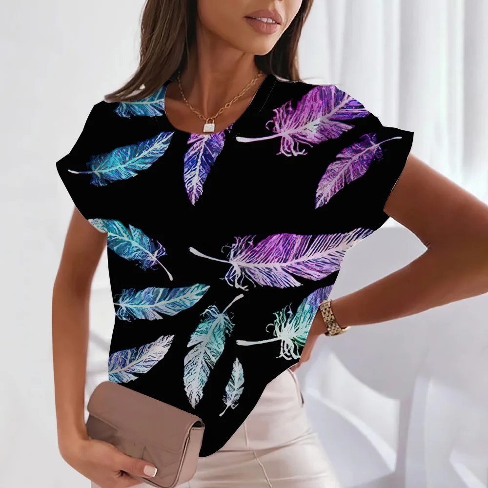 Women's T-shirt 3d Feather Print V-neck Tops Summer New Simple Harajuku Short-sleeved Fashion Loose Large Size Women's Tops