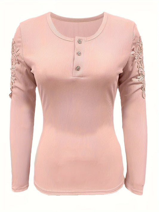 Sexy Slim Tops Women Lace Sleeve Flower Button T Shirts Female Fall Bodycon Tee Clothes