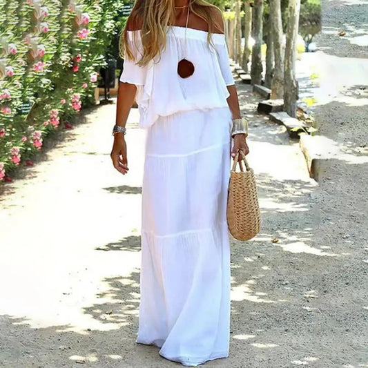 Off Shoulder Elegant Maxi Dress Short Sleeve Elastic Waist Large Hem Women Dress Sexy Summer Casual Slash Neck Lady Dress