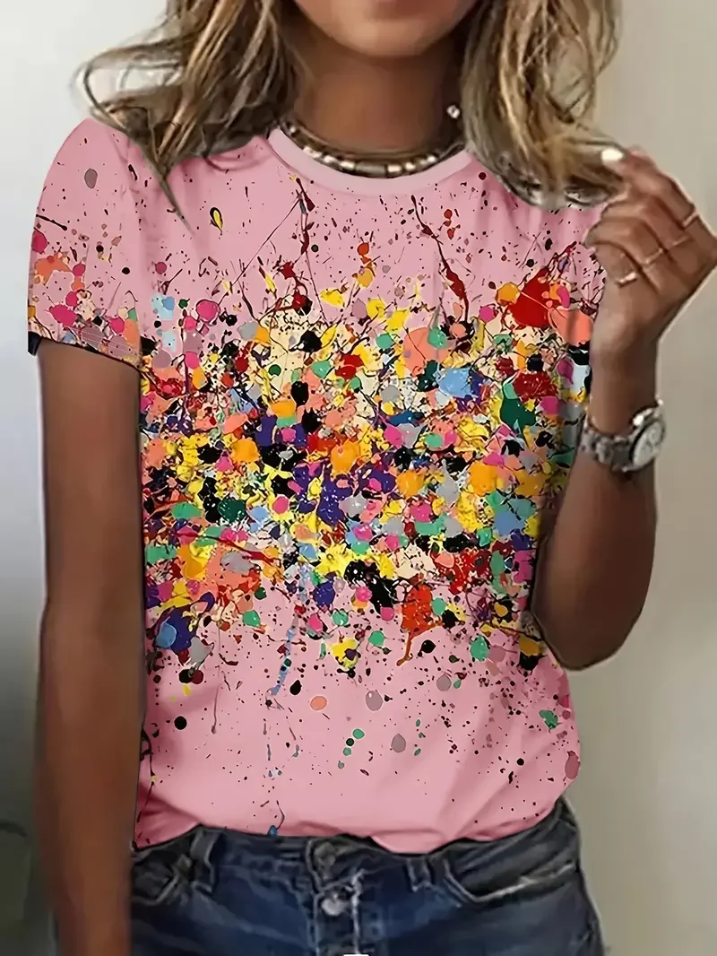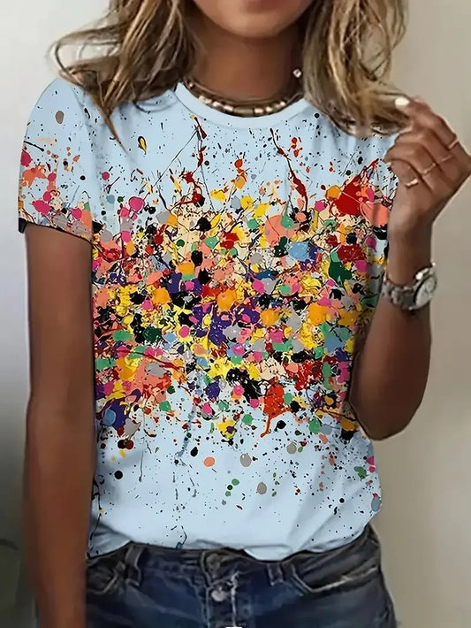 Summer Women's T Shirt Colorful Abstract Print O Neck Casual Short Sleeve Tees Female Overszied Clothing Fashion Street Pullover