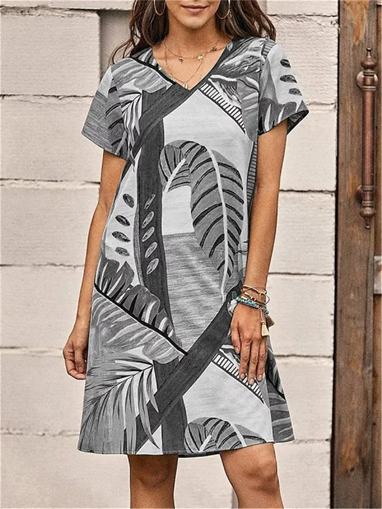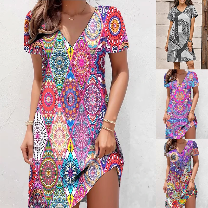 Summer V Neck Print Dresses For Women Elegant Office Ladies Dress Fashion Short Sleeve Casual Boho Beach Party Dress Robe Femme