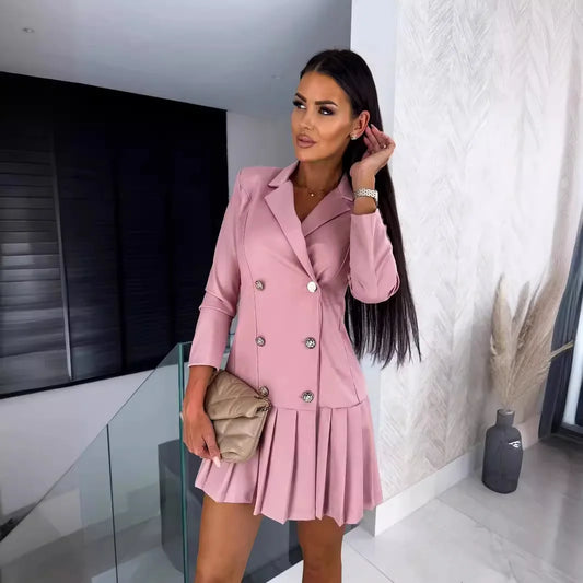 New Women's Double Breasted Zipper Mini Dress Autumn Winter Dress Women's Fashion Long Sleeve Turn-down Collar V-neck Dress