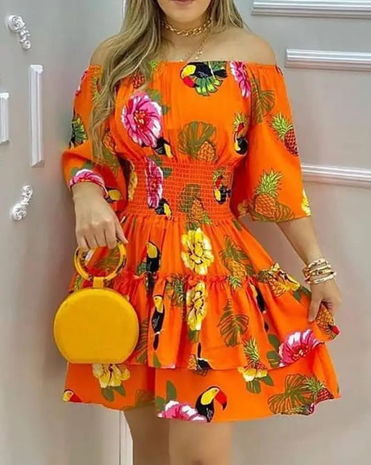 Womens Dresses 2024 Spring Fashion Tropical Print Off Shoulder Casual A Line Mini Shirred Waist Daily Vacation Dress