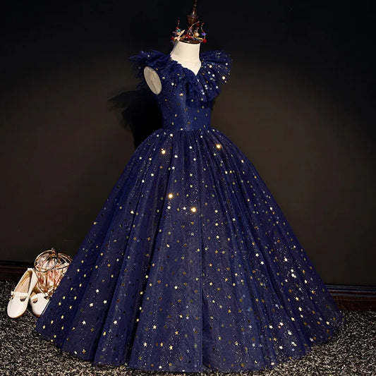 Girls Prom Bule Dress Flower Kids Pageant Wedding Ball Gown for Children Star Sequins Dress Teenagers Performance Vestidos