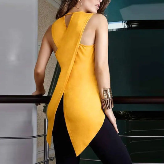 Women Summer Fashion Solid Color Sleeveless Irregular Cross Back Vest Tank Top
