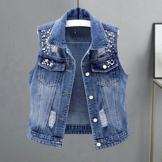 Faux Pearl Beads Women Vest Single-breasted Vintage Cowboy Waistcoat Hole Hip Hop Waistcoat Denim Waistcoat Sleeveless Jacket